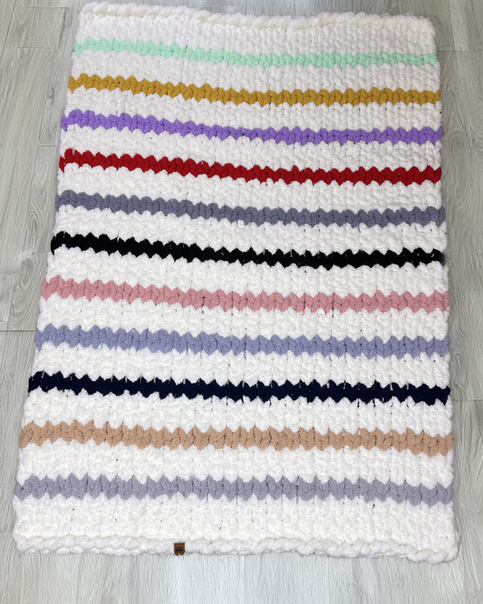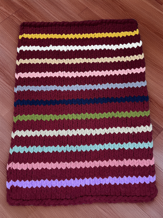 Handmade chunky chenille yarn blanket - Burgundy with multicolor stripes