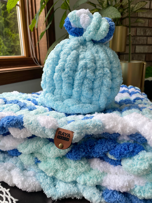 Handmade blanket made with love of 100% soft and cozy polyester chunky chenille yarn, a gift for a cute baby.