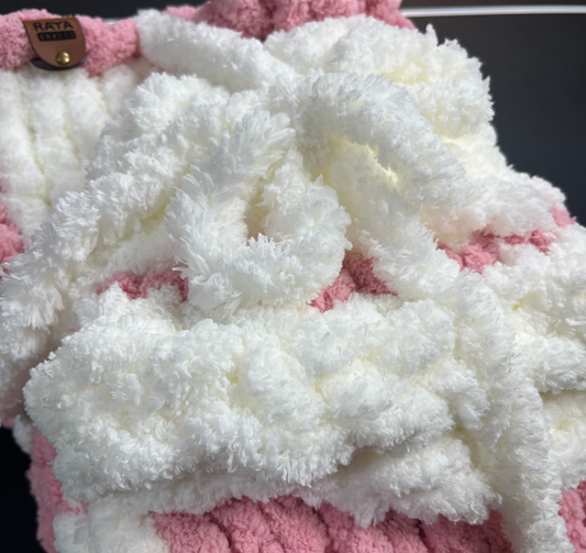 Handmade blanket made with love of 100% soft and cozy polyester chunky chenille yarn, a gift for a cute baby girl.